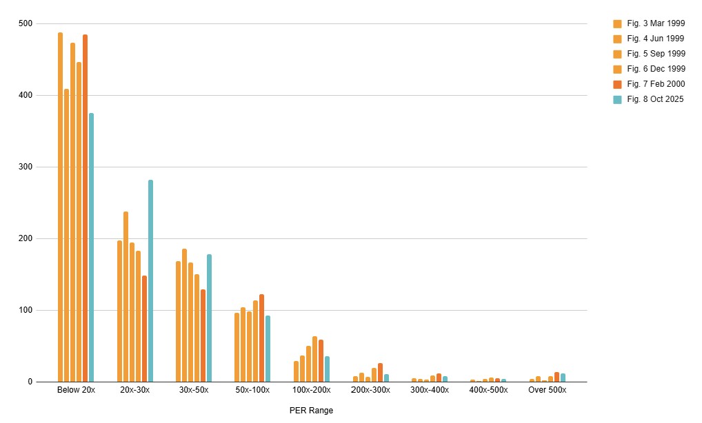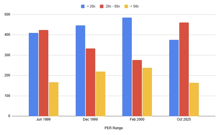 Today, the situation is reversed. A healthy 46% of companies reside in that 20x-50x PER range, a figure higher even than the 42% seen in mid-1999, before the real mania began. This suggests that while enthusiasm is high, a broad-based discipline on valuations remains intact.
