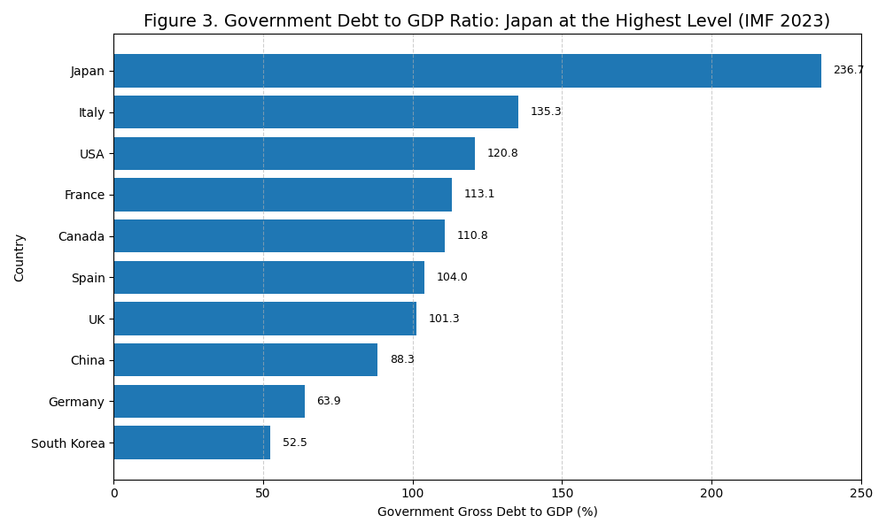 Global Comparison: As shown in Figure 3, Japan’s debt-to-GDP ratio of 249.7% (as of 2023) is by far the highest among major countries listed, nearly double that of Italy (134.6%) and significantly exceeding the US (118.7%)